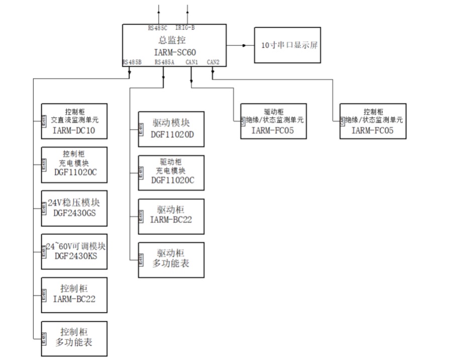 監控部分采用集散方式對系統進行監測和控制,驅動柜和控制柜的饋電的運行狀態、電源模塊運行參數,分別由兩臺智能監控系統采集處理,由監控模塊統一處理后顯示在觸摸屏上,同時可通過人機交互操作方式對系統進行設置和控制,還可接入遠程監控。監控模塊還能對每個充電模塊進行均/浮充控制、限流