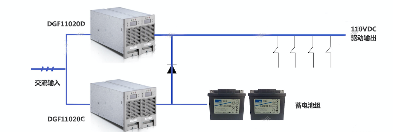 交流輸入正常時,交流電源經充電模塊輸出DC110V母線、母線上接UPS、24VDC降壓模塊24~56VDC可調模塊,同時給DC110V負載供電,充電模塊同時對蓄電池組進行充電。一旦交流輸入中斷時,充電模塊停止工作,蓄電池組直接向110VDC母線提供電力負荷,從而保證110VDC母線不間斷供電。